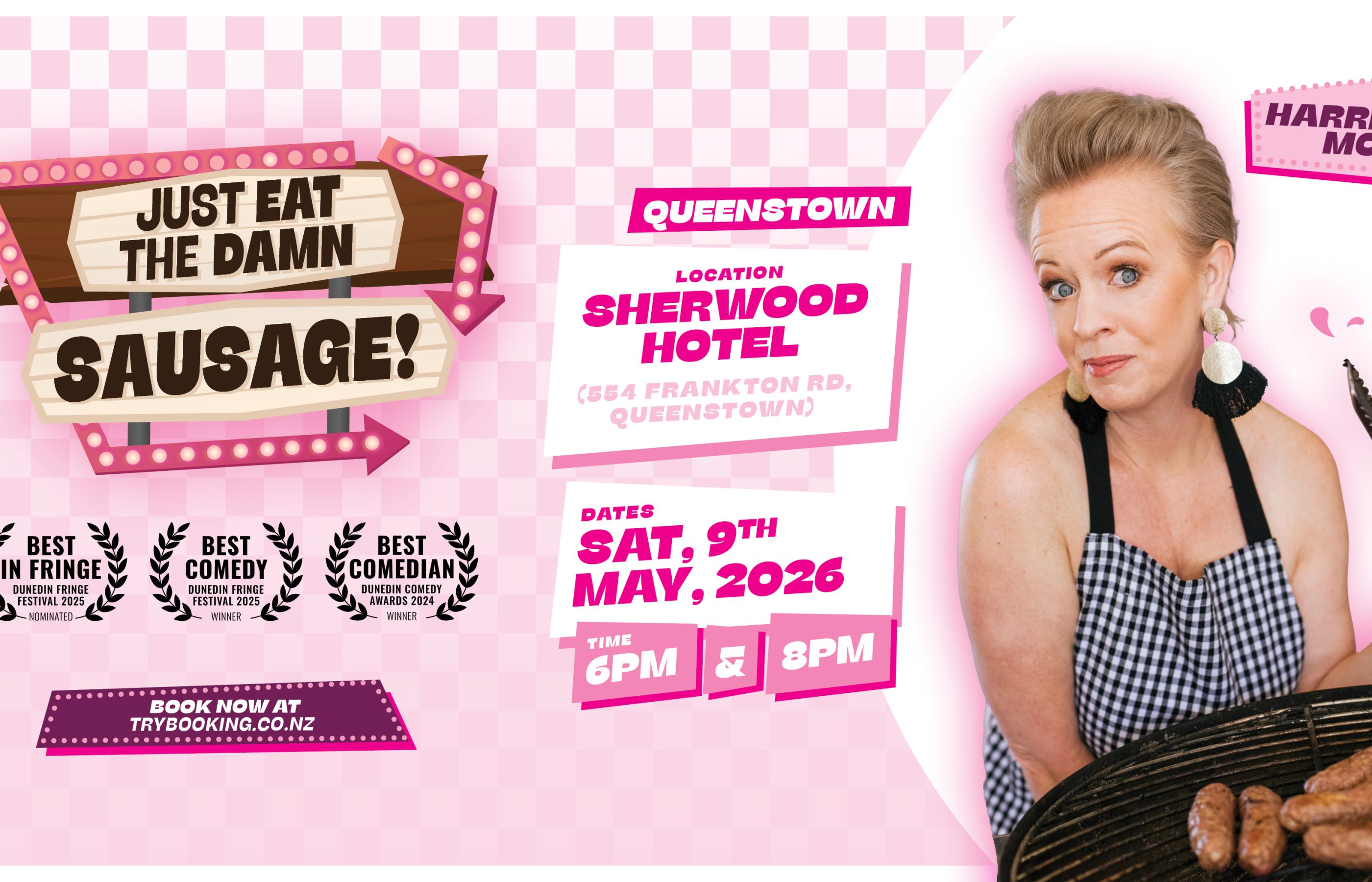 Queenstown audiences will recognise Harriet from the Central Otago Whine Tour comedy shows and previoulsy supporting Ben Hurley and Ed Byrne.